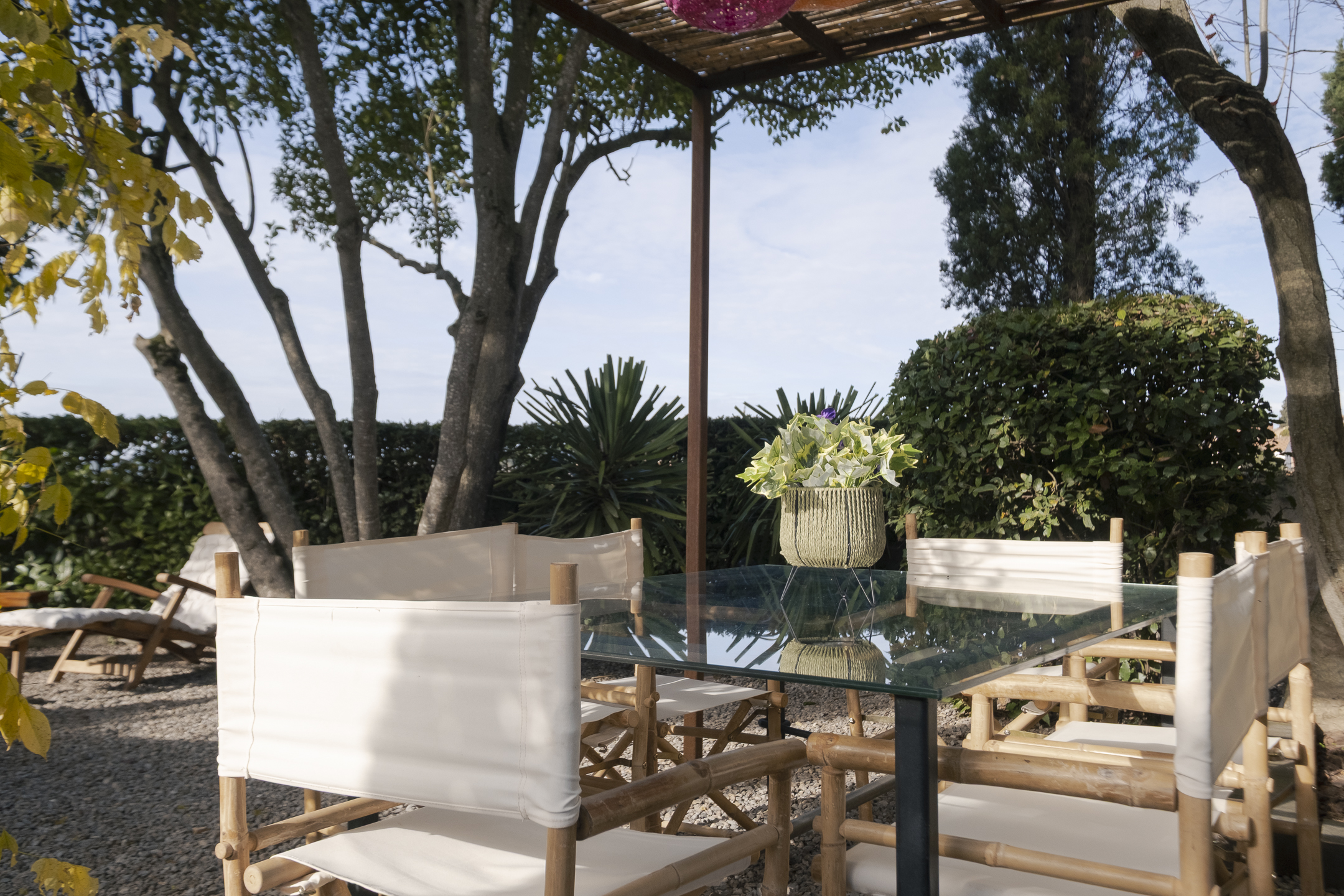 Barbacoa, taules i cadires d'exterior, gandules, pèrgola, bancs, para-sol